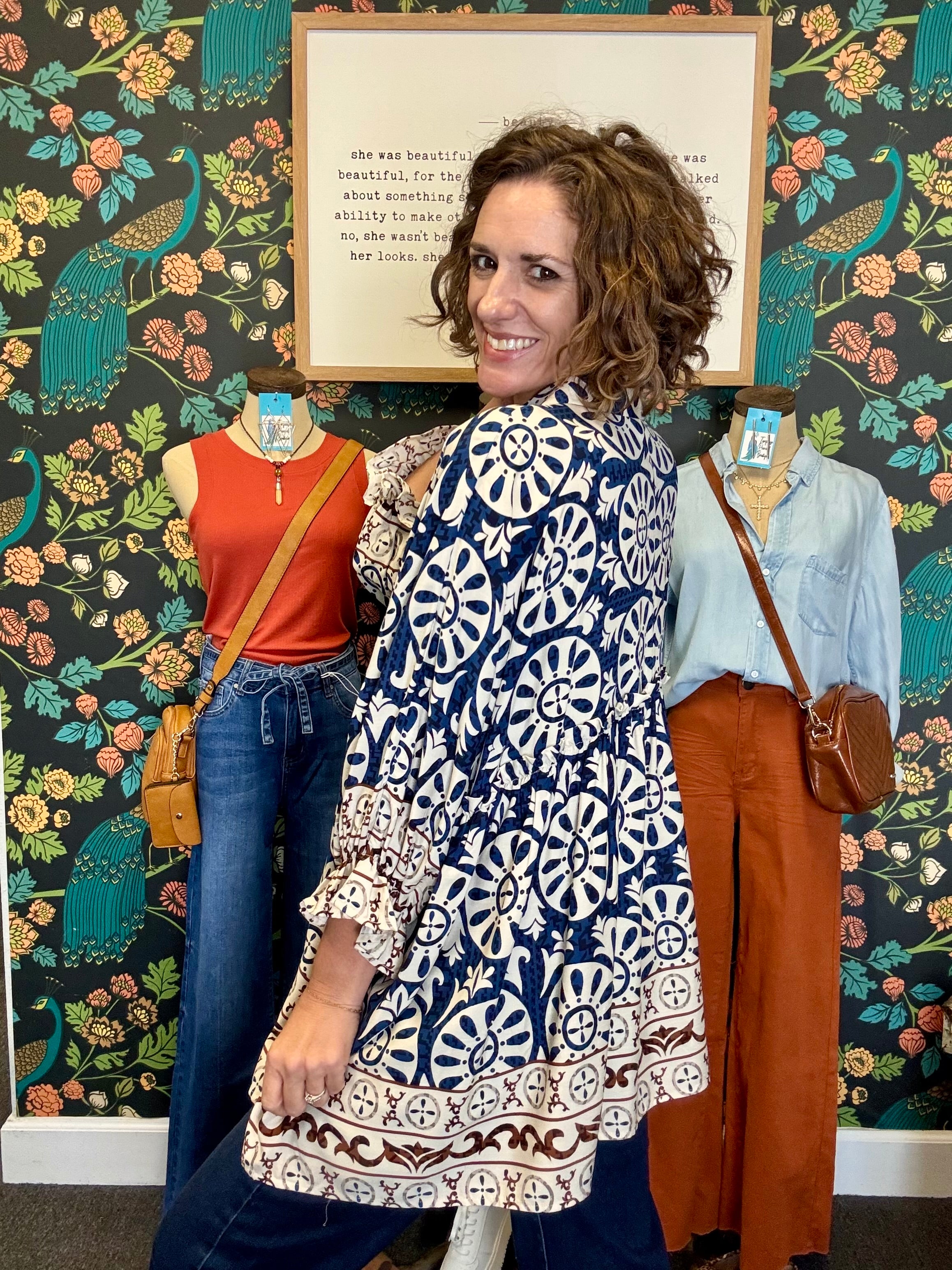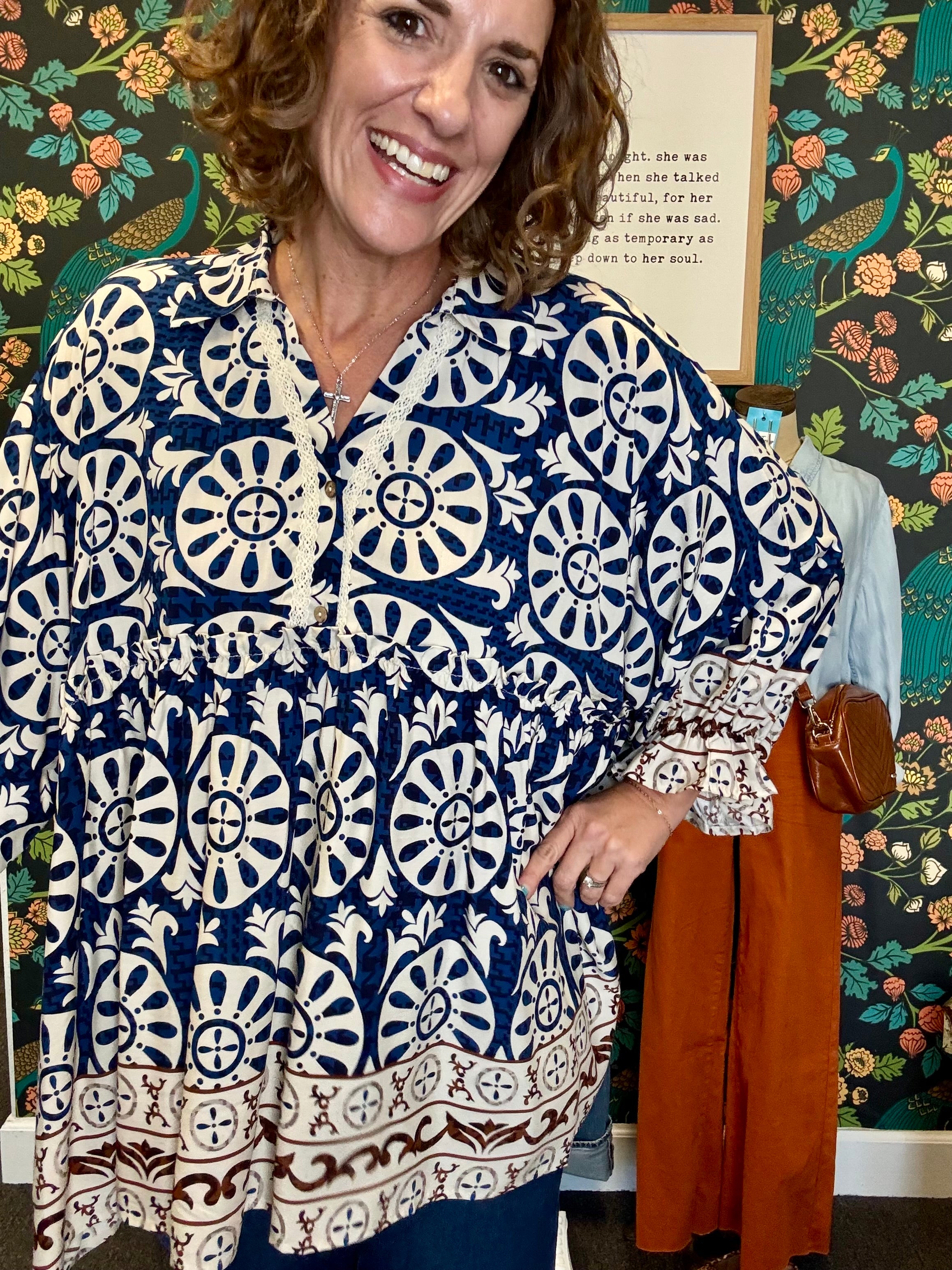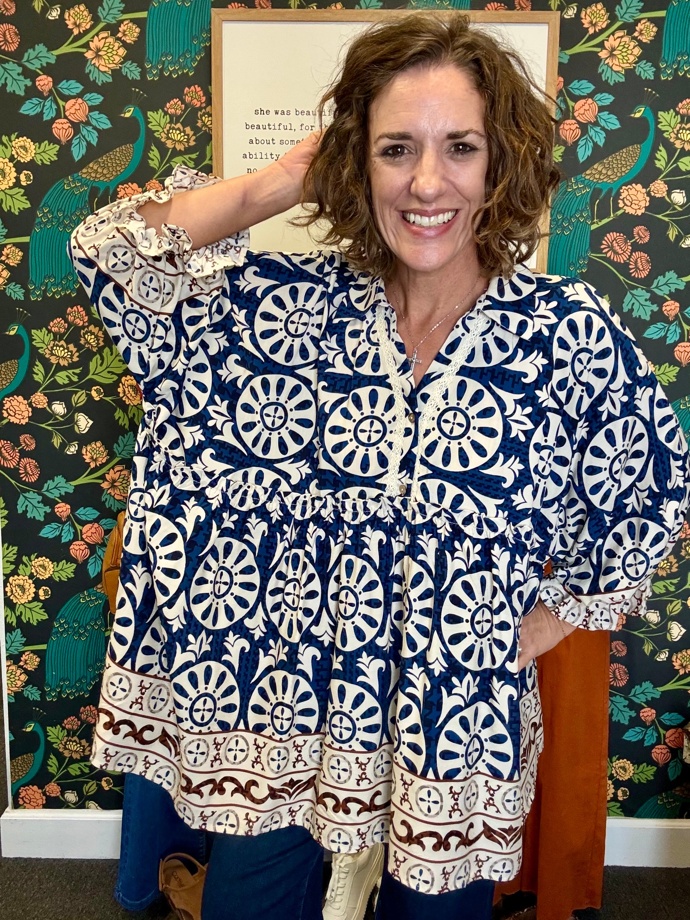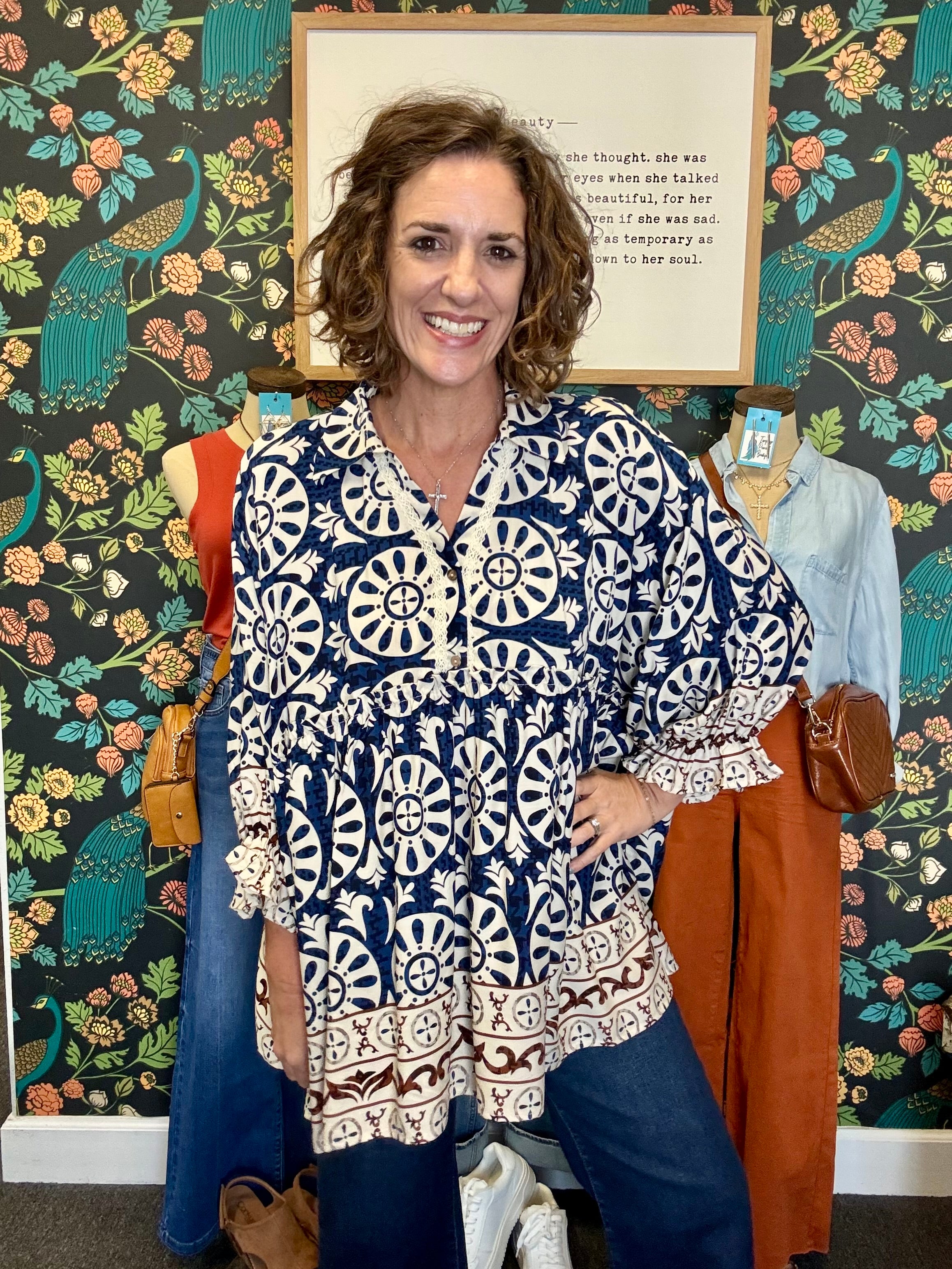 Effortless and flowy, the Bluewood Top brings together shades of blue, cream, and chocolate in a beautifully oversized silhouette. Its blousy fit drapes with ease, giving you that relaxed yet polished look perfect for any occasion. Lightweight and breathable, this top is made for pairing with your favorite denim.
