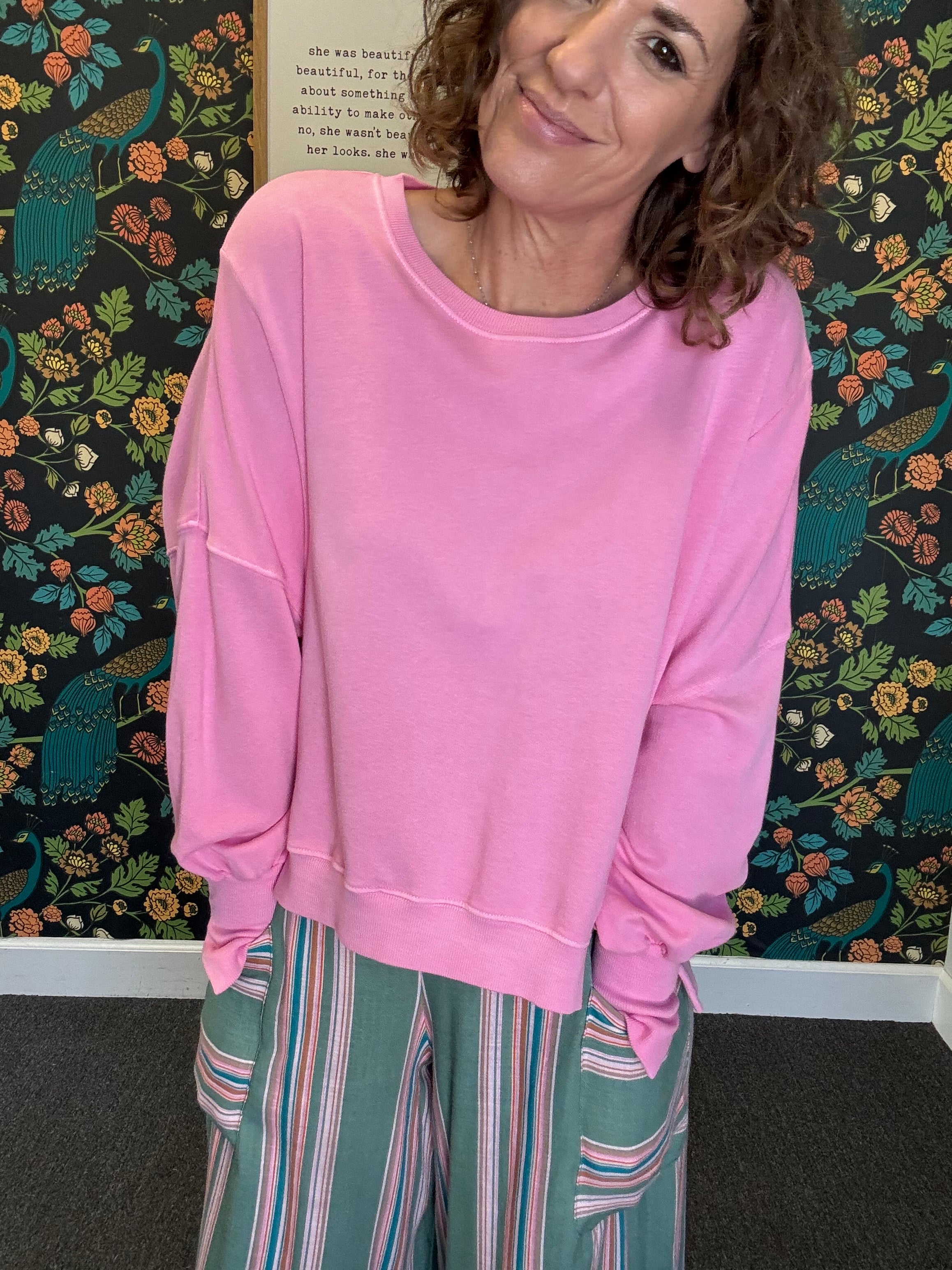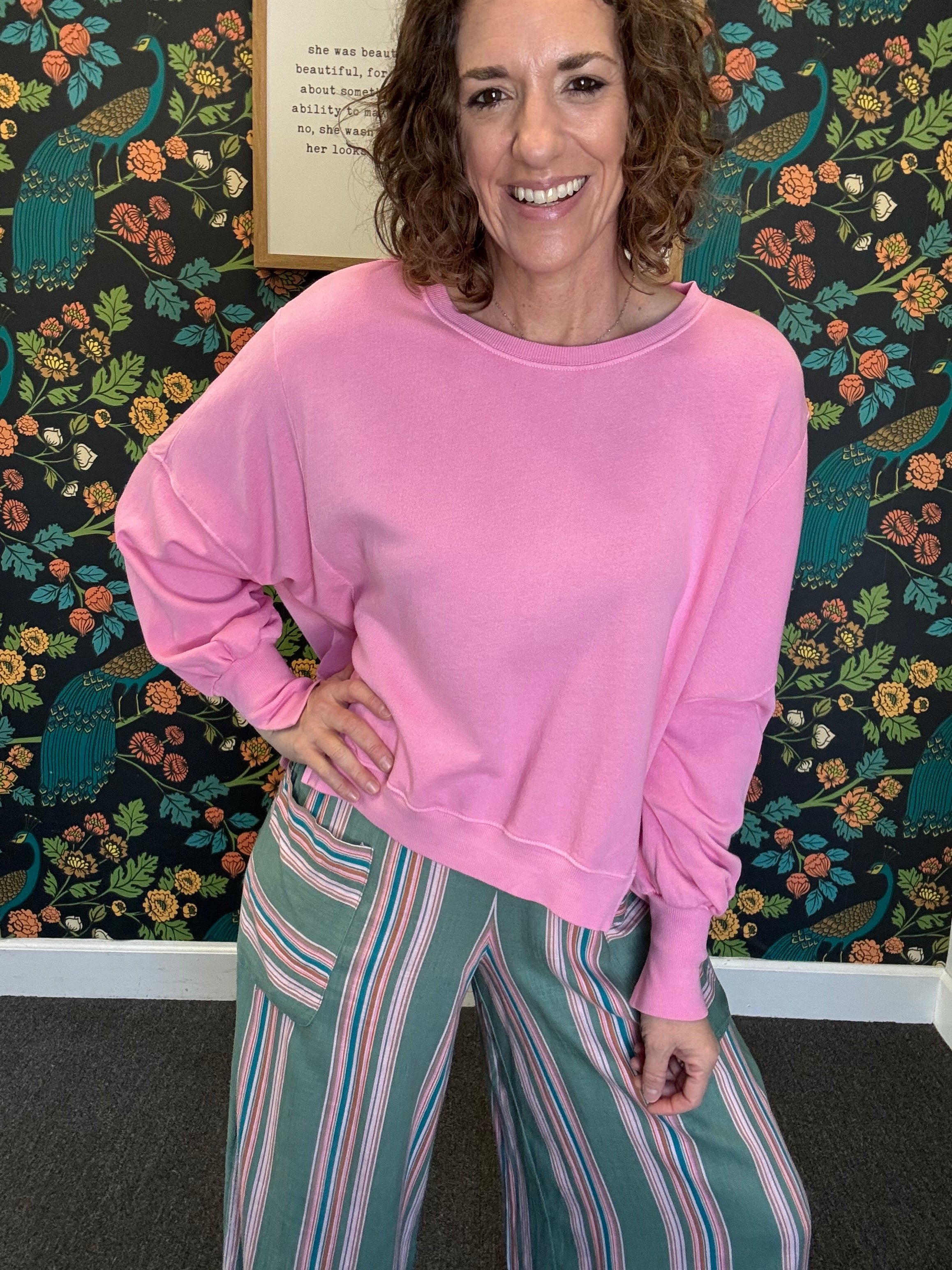 Cozy up in the Cashmere Rose Trenton Pullover — a lightweight sweater designed for effortless comfort and relaxed style. With a classic crew neck and an oversized fit, this long-sleeve pullover delivers unmatched softness and warmth without feeling heavy. Perfect for casual days, running errands, or lounging at home, it’s an easy, go-to piece that pairs beautifully with denim, leggings, or joggers for a perfectly laid-back look.