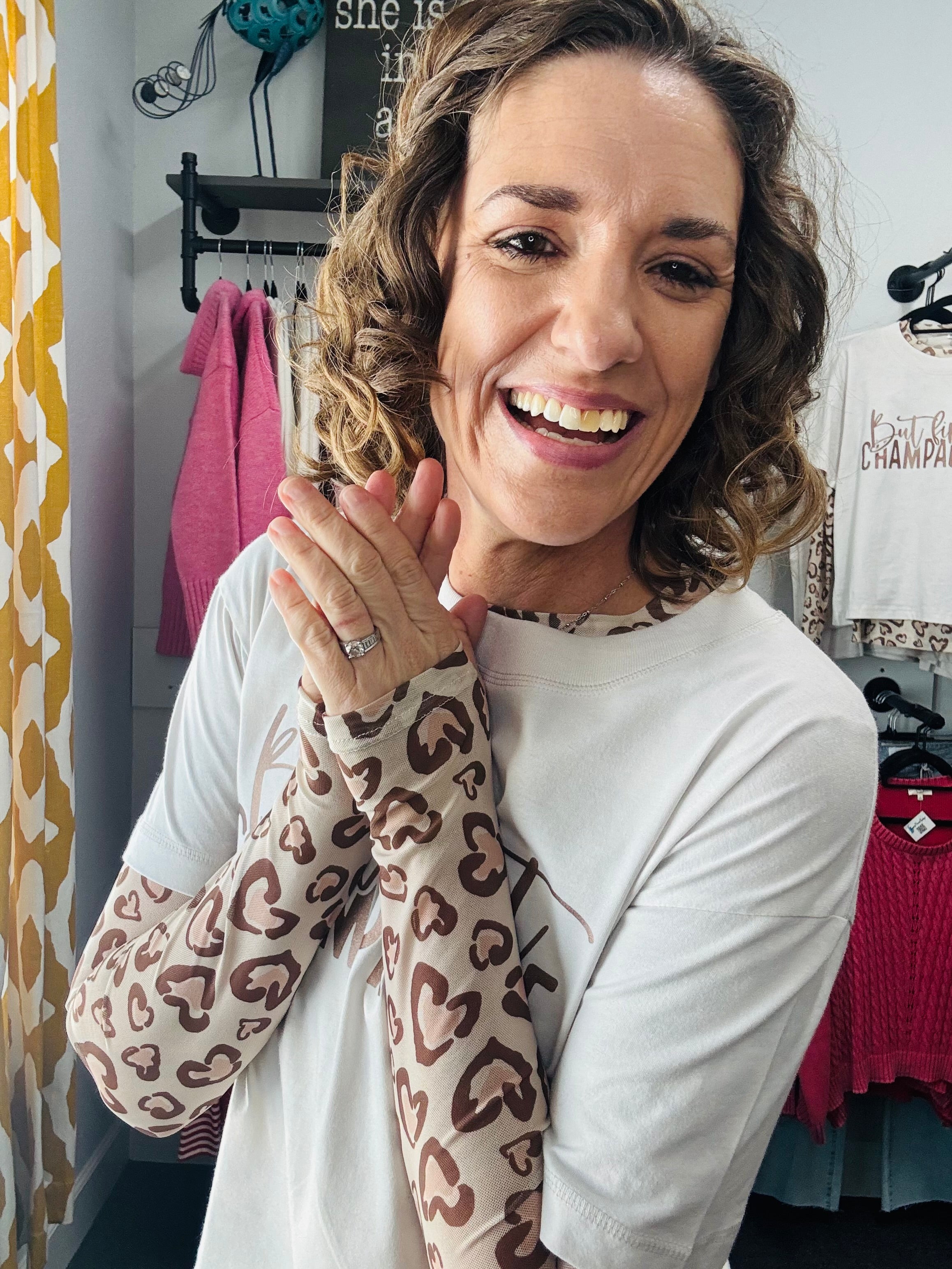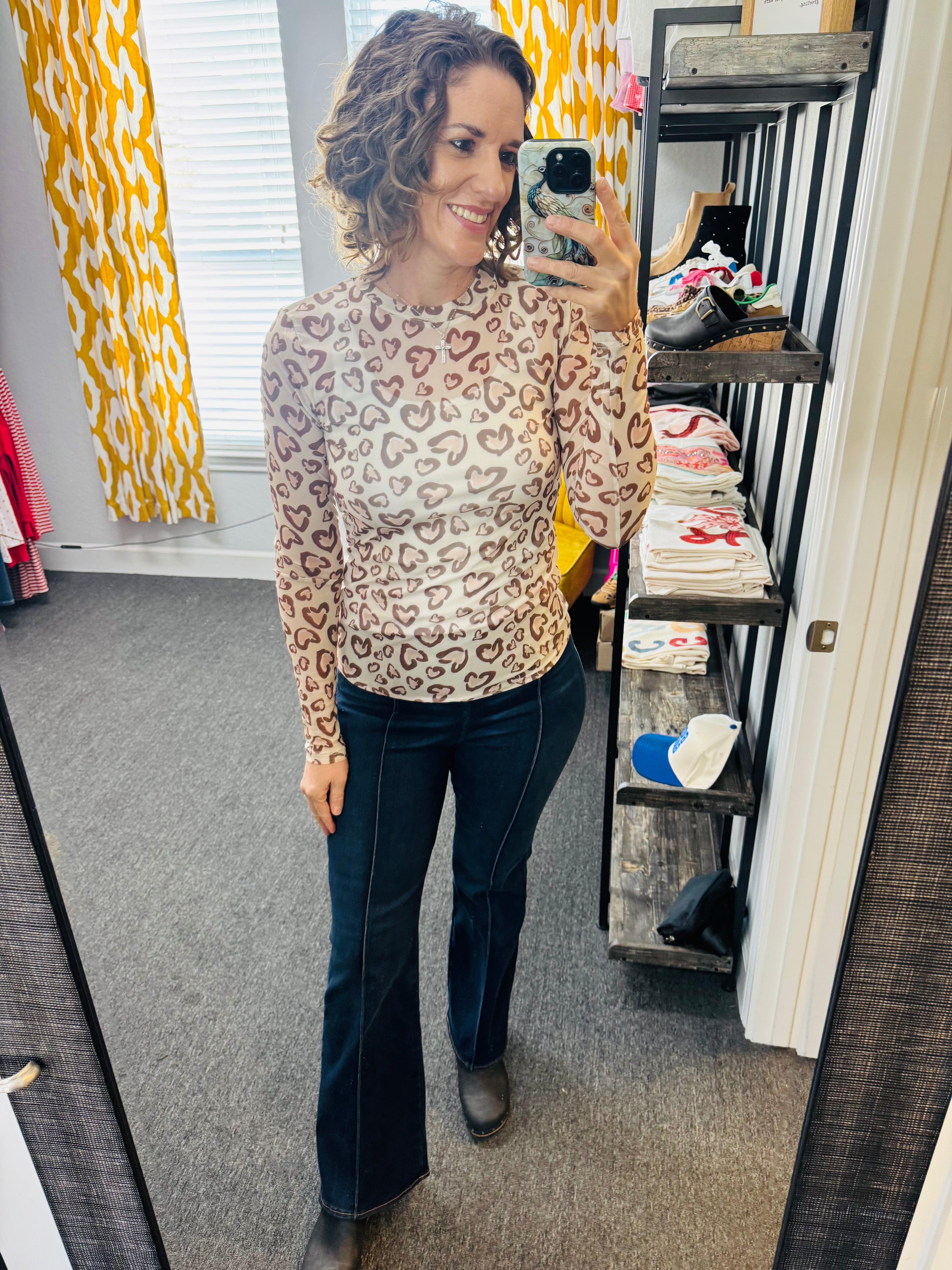 The perfect layering piece with a little edge. Our Cheetah Hearts Mesh Top is a sultry, stretchy long-sleeve featuring a totally sheer mesh design in soft tan, beige, and blush tones with an all-over cheetah heart print. Designed with a classic crew neckline and thumbhole details, it’s perfect worn over a cami or paired under your favorite tee or sweater. Lightweight, comfortable, and made to elevate any outfit.