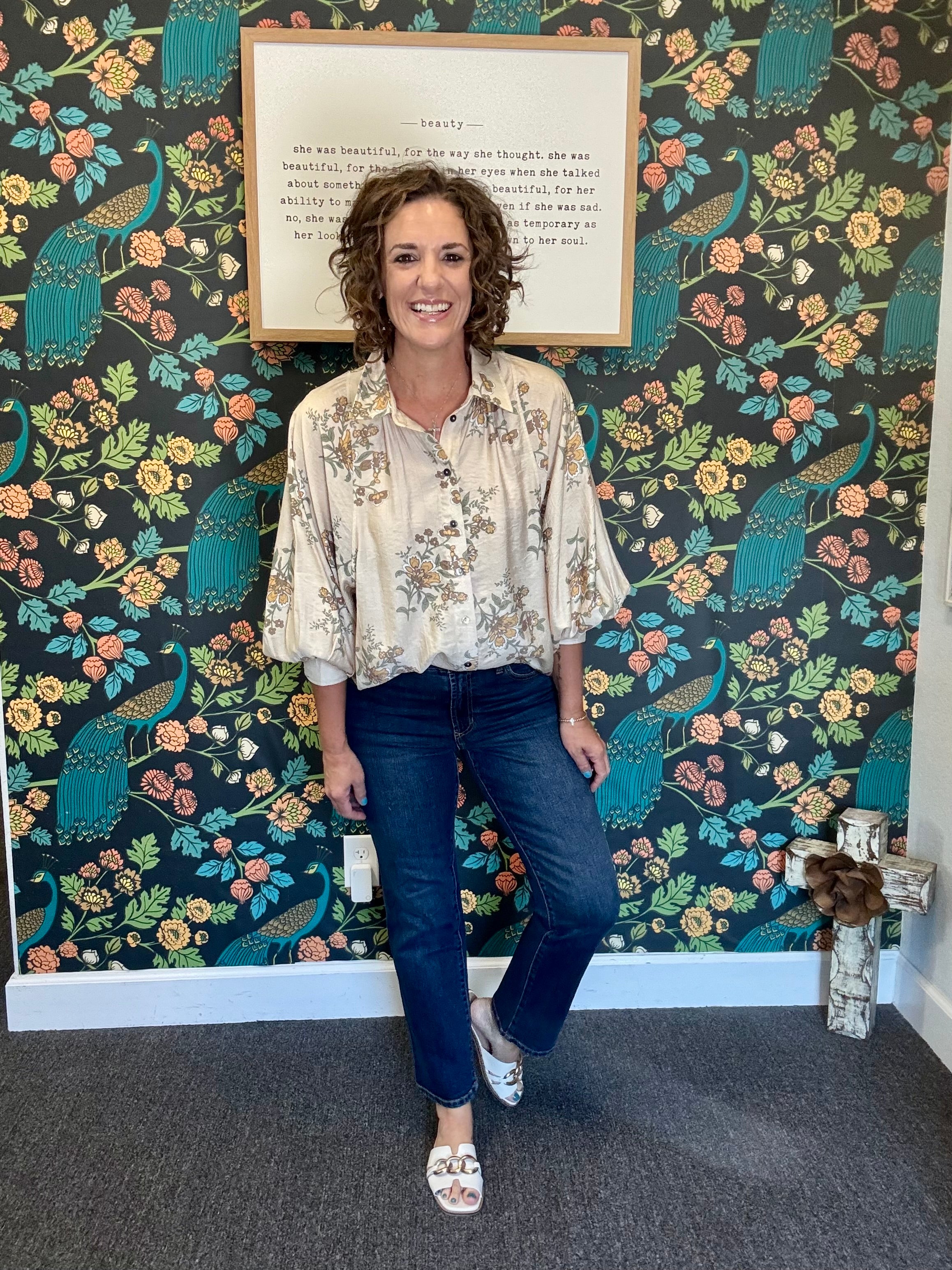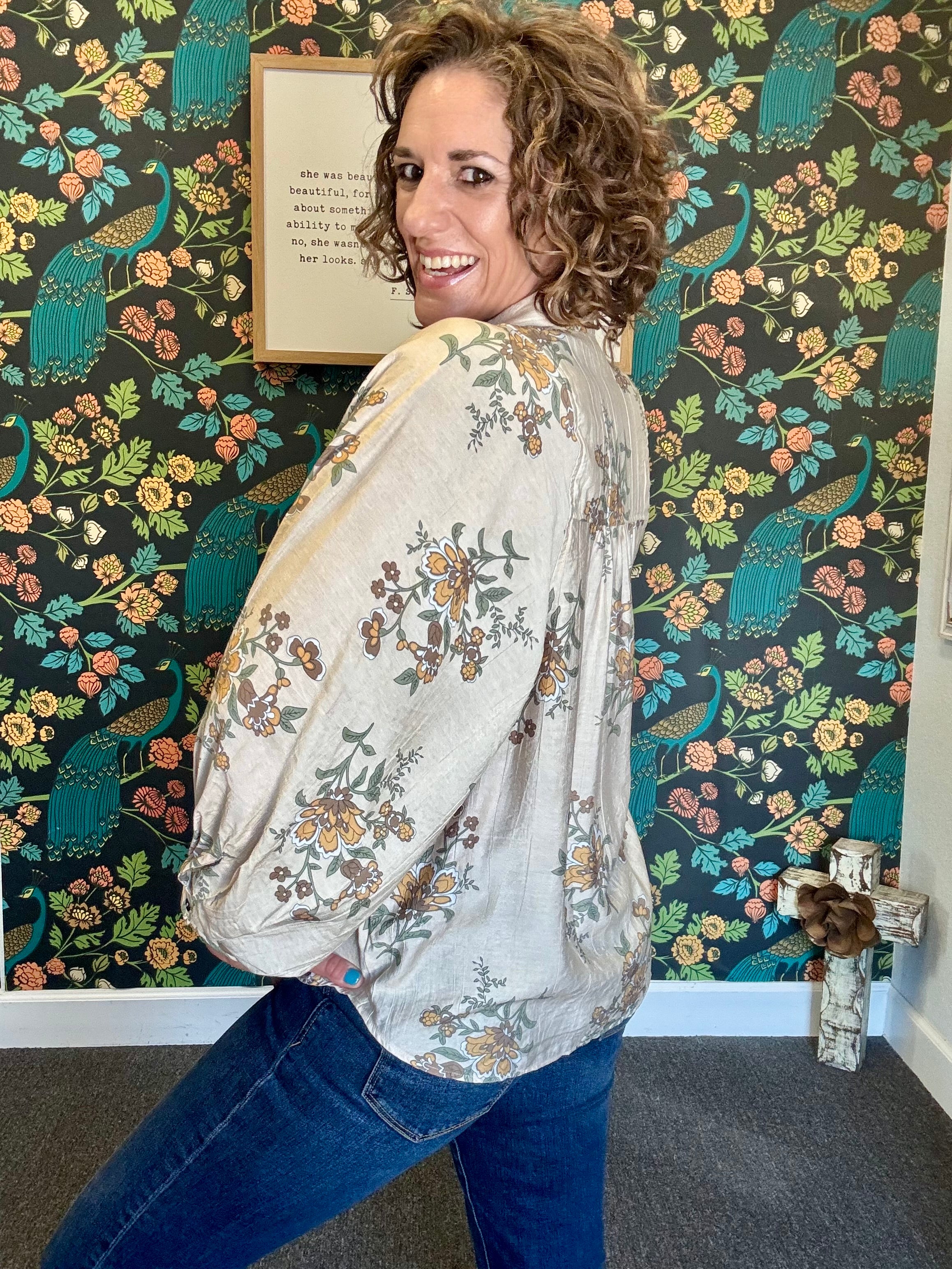 The Ecru Whisper Top features soft slate green florals on an ecru backdrop. With long sleeves and a flowy, relaxed fit, it’s lightweight, feminine, and perfect to dress up or down. Pair with denim or trousers for effortless style.