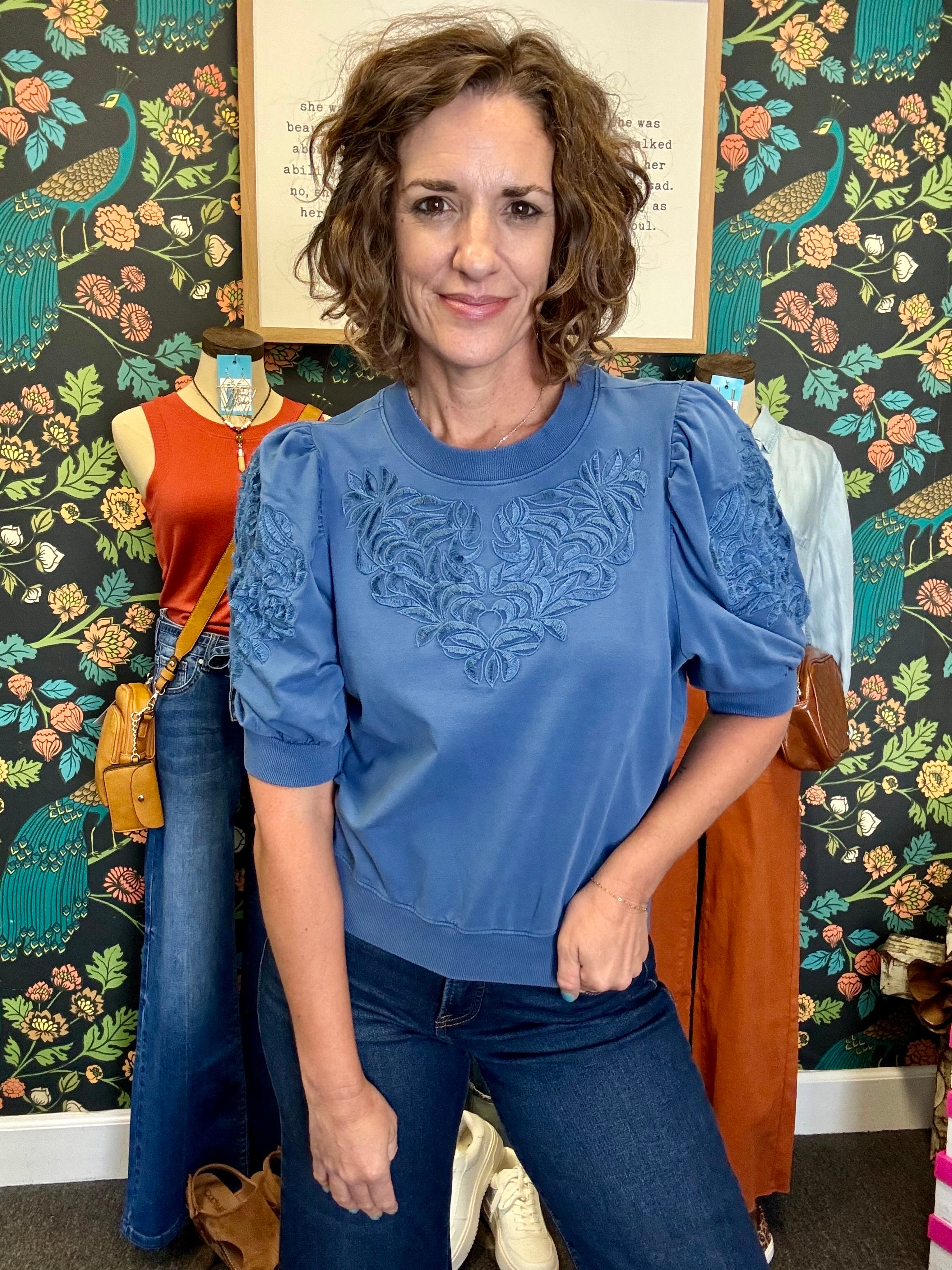 The Galaxy Blue Kyle Top combines elegance and comfort with its elbow-length sleeves and detailed embroidery, elevating your casual ensembles with a touch of sophistication. Its stunning blue hue and refined design make this beloved style from last year an essential piece for a polished, effortless look.