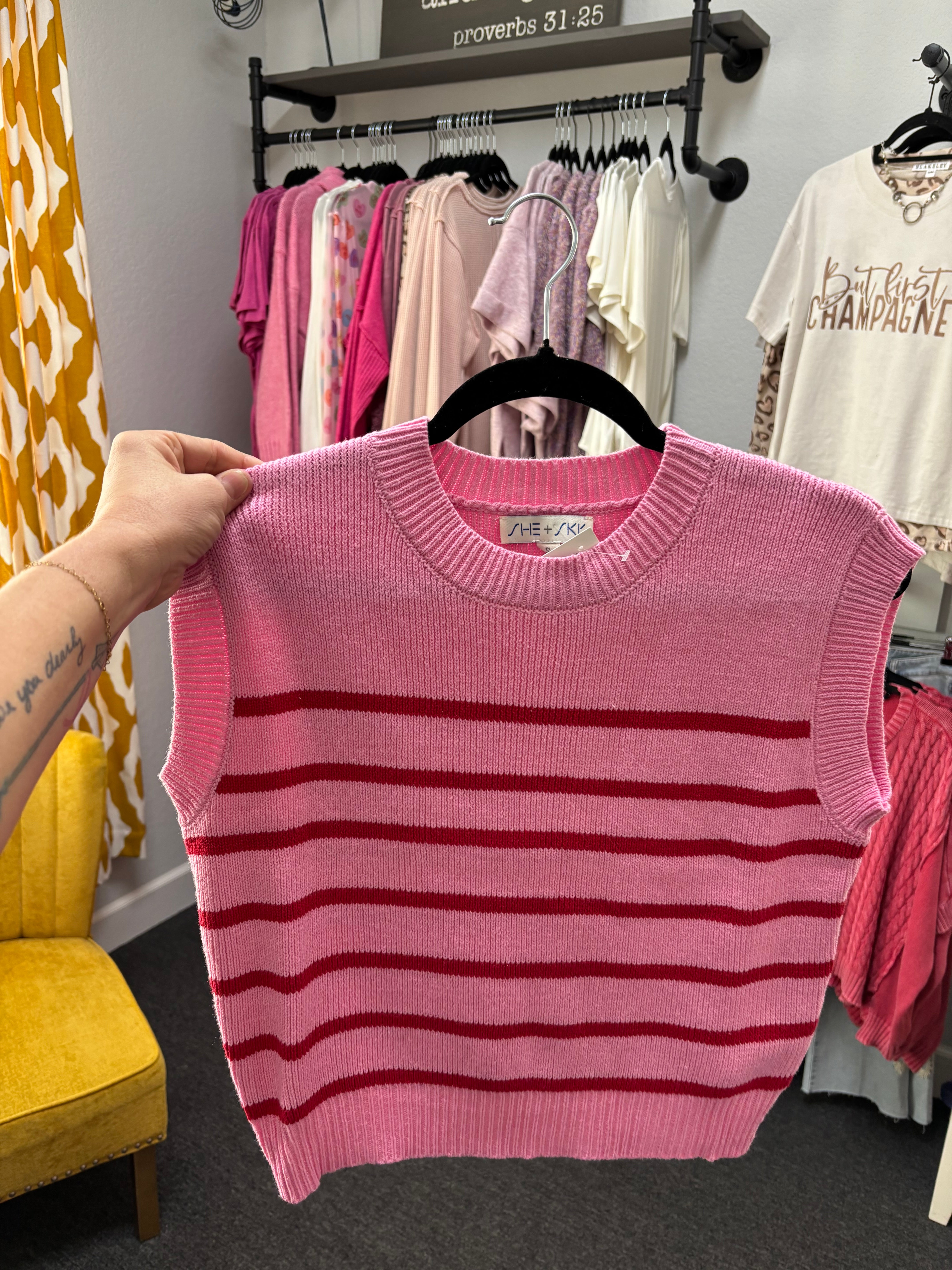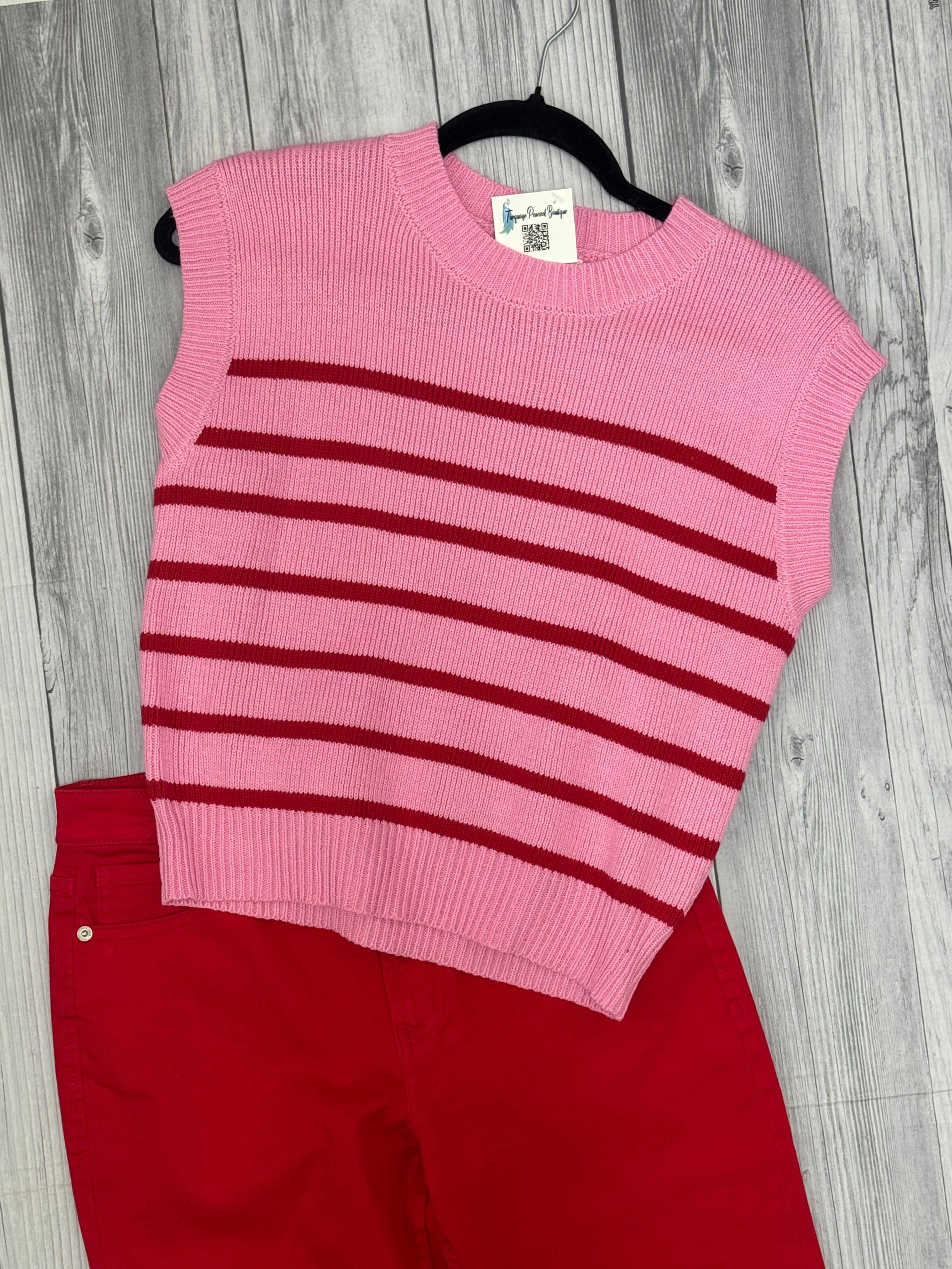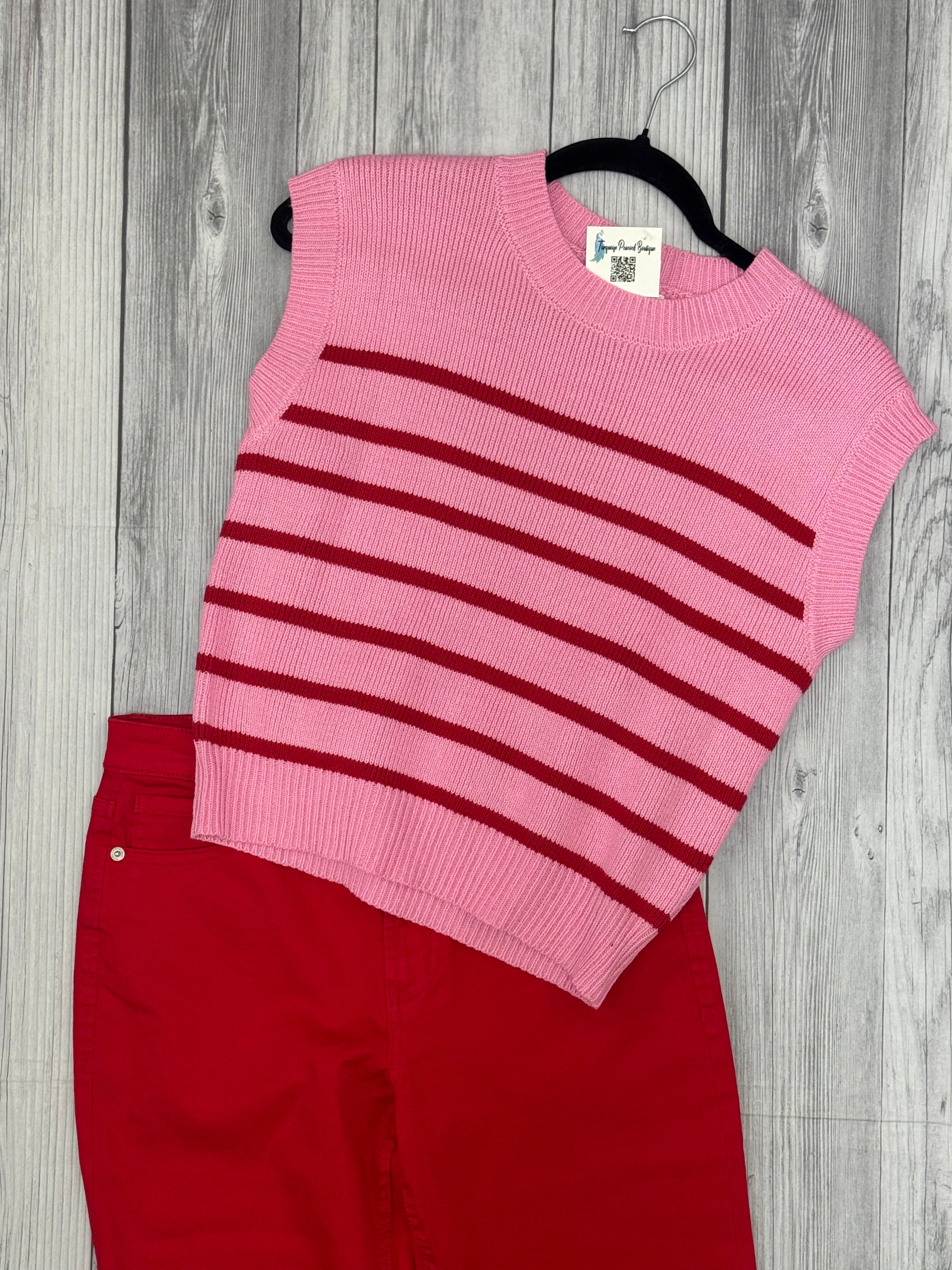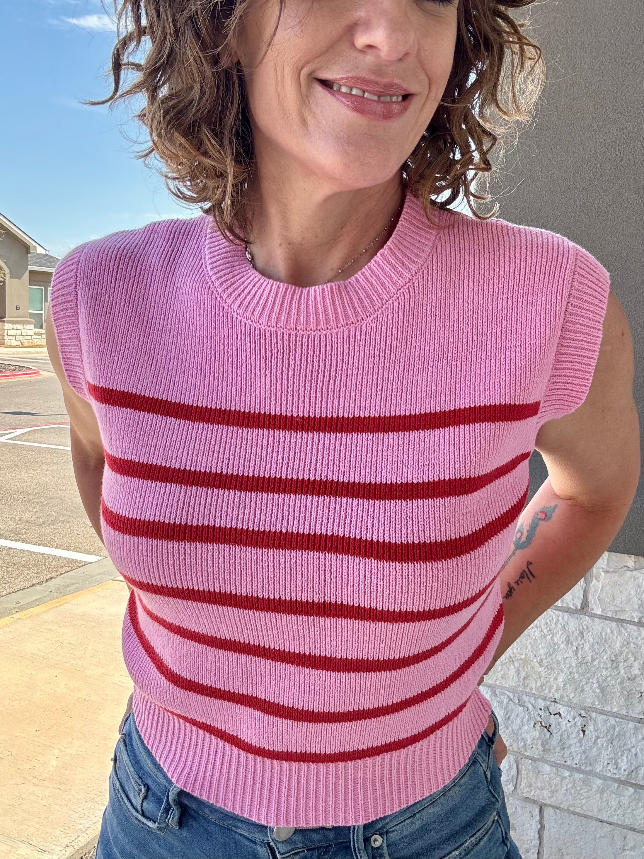 The Pink Crush Striped Sweater features a soft pink base with bold red stripes for just the right pop of color. This sleeveless knit is lightweight and easy, making it perfect for layering now and wearing solo as the days warm up. Effortlessly cute with denim and sneakers, it’s that grab-and-go piece customers keep coming back for — polished, playful, and ready for spring.