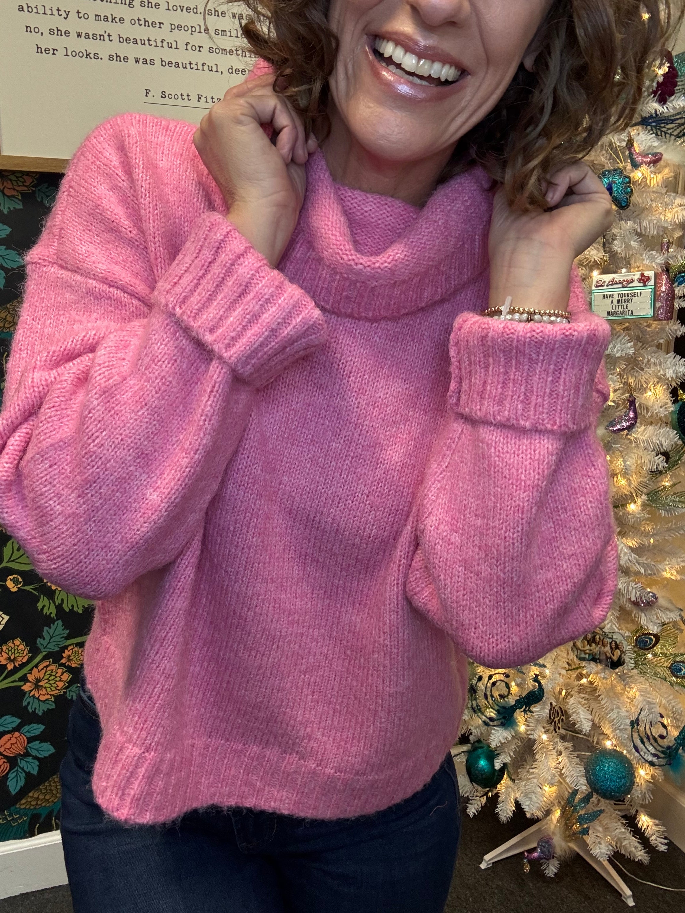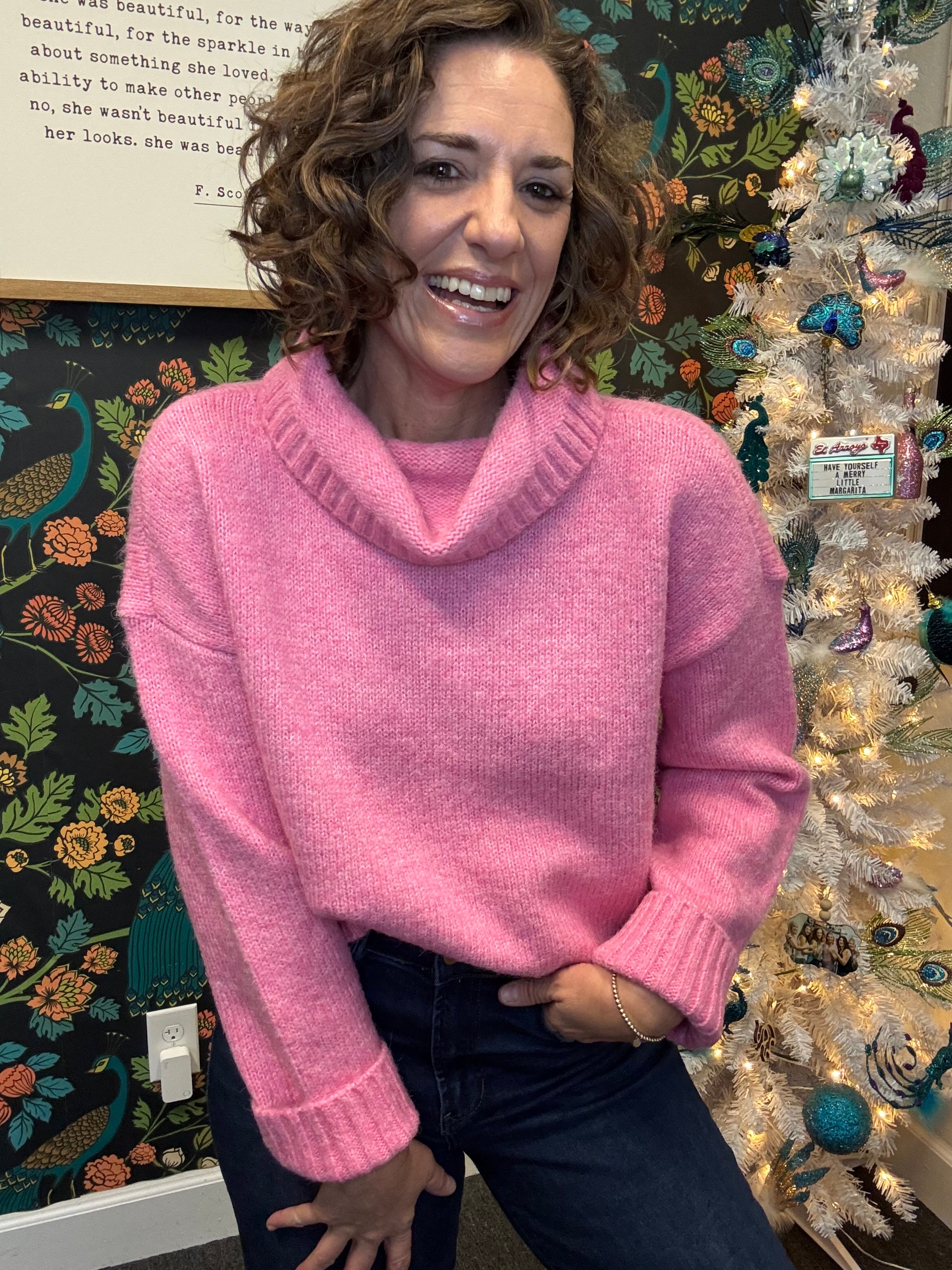 Add a pop of seasonal color with our Pink Evangeline Sweater! This long-sleeve cowl-neck sweater comes in a bright lemonade-pink hue, blending cozy comfort with chic, everyday style. Crafted from soft, warm yarn, it’s perfect for staying snug while looking effortlessly stylish throughout the season.