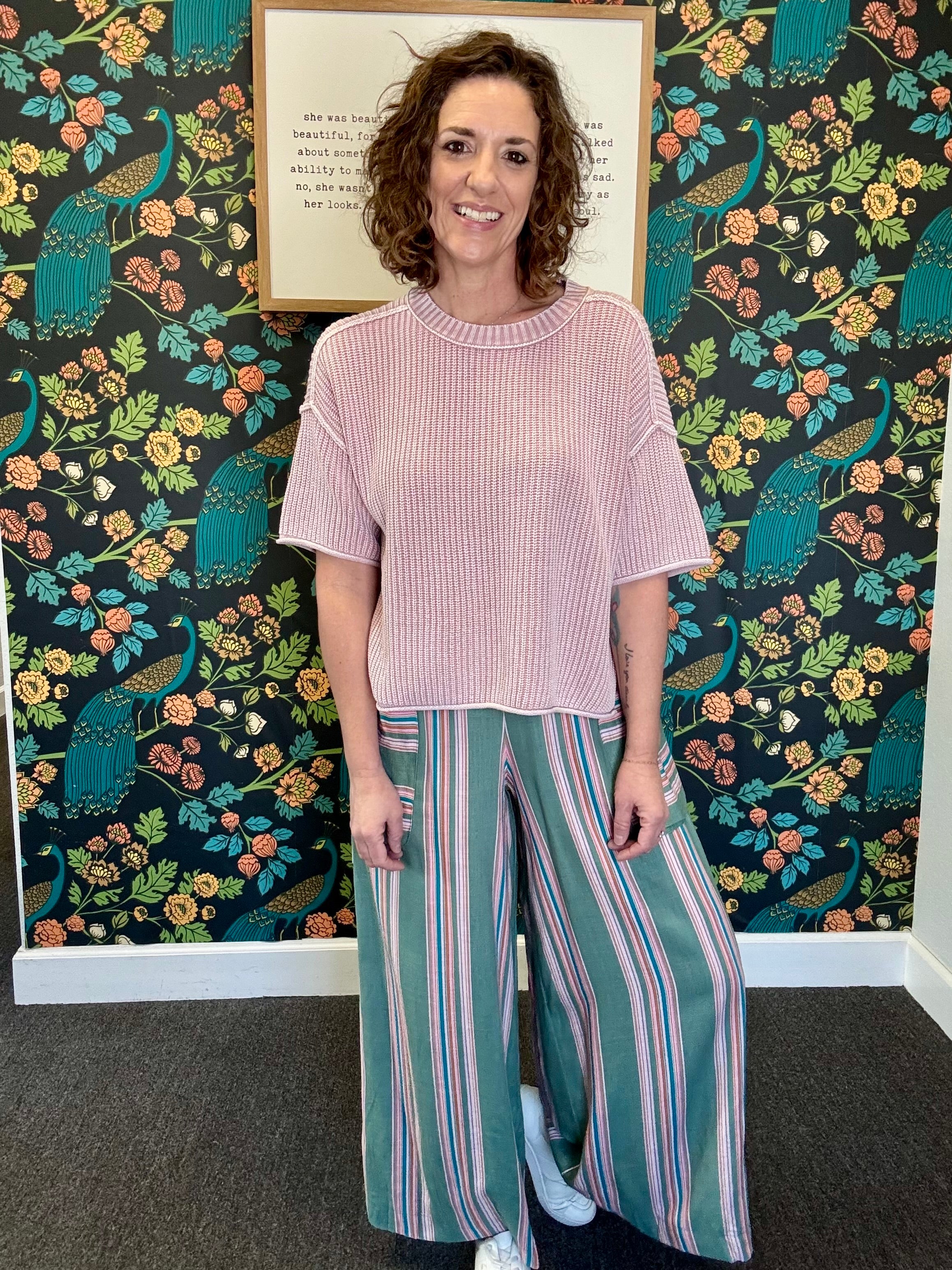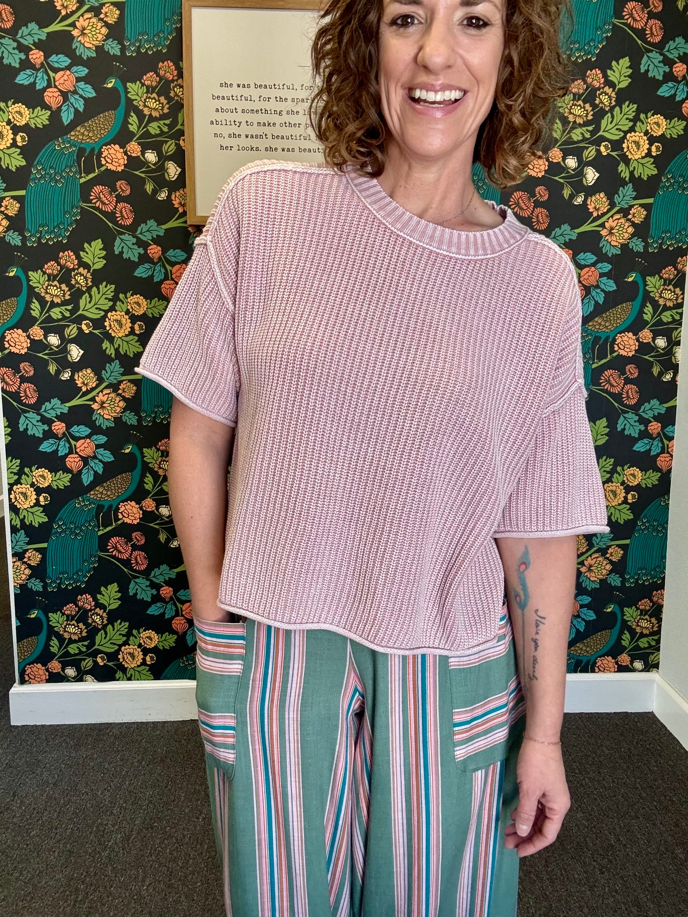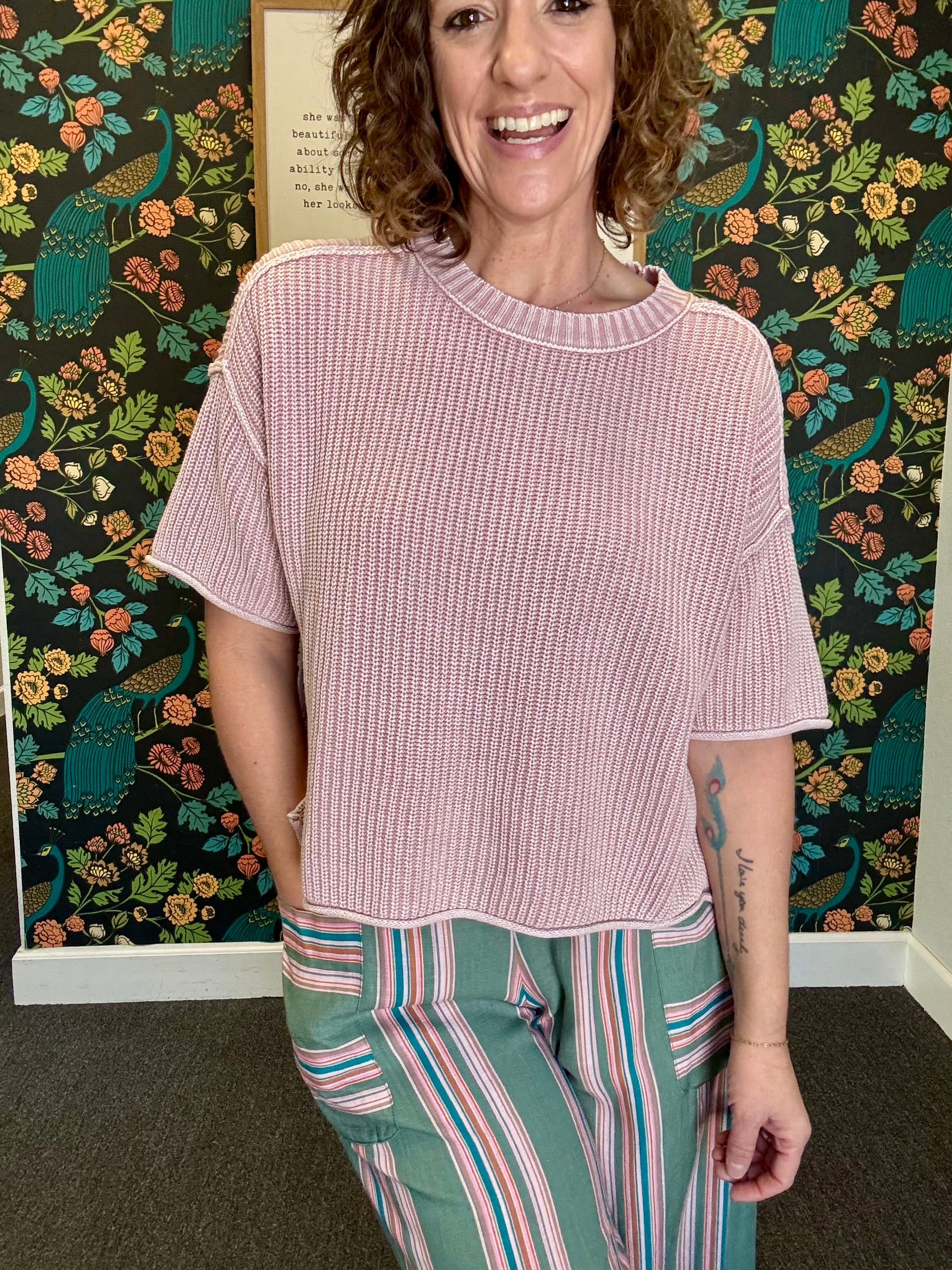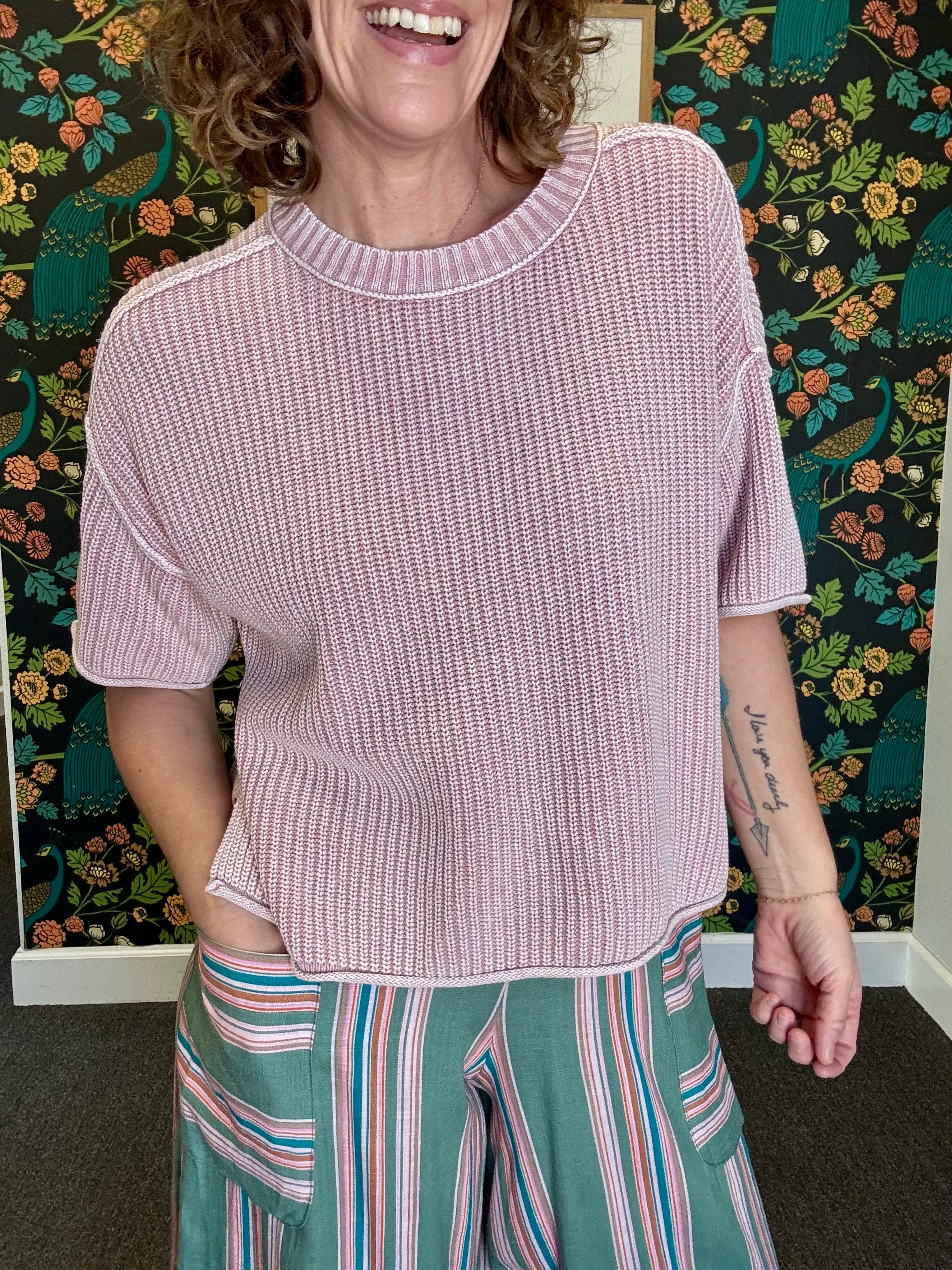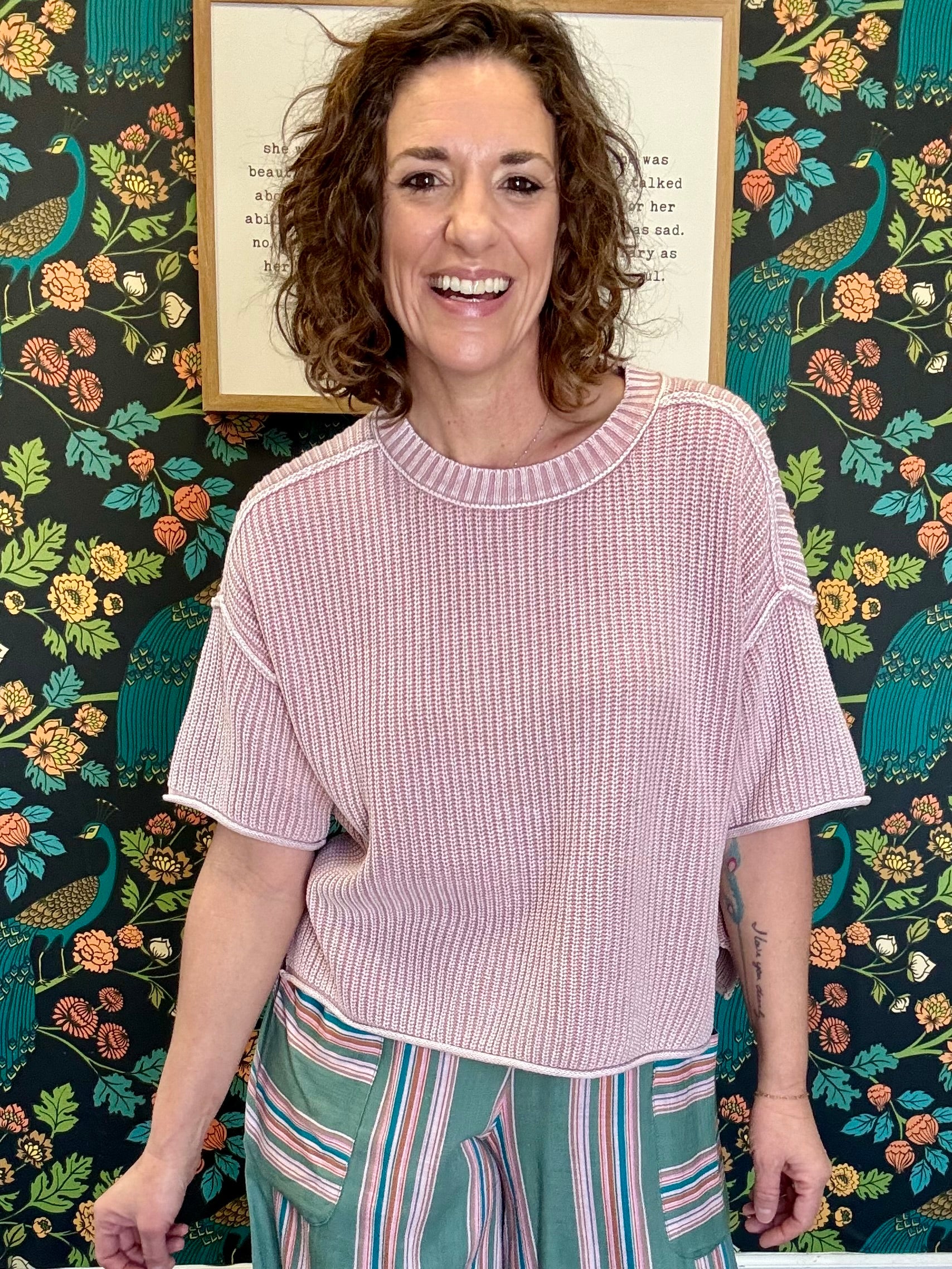 Soft, romantic, and effortlessly wearable—the Rosewater Ribbed Top is that throw-on-and-go piece that still feels special. Designed in a washed dusty rose hue with a ribbed texture and raw-edge details, this slightly boxy, relaxed silhouette gives you that perfectly lived-in vintage feel. Pair it with our white jeans for a fresh, clean spring look, or style it with your favorite denim for everyday ease.
