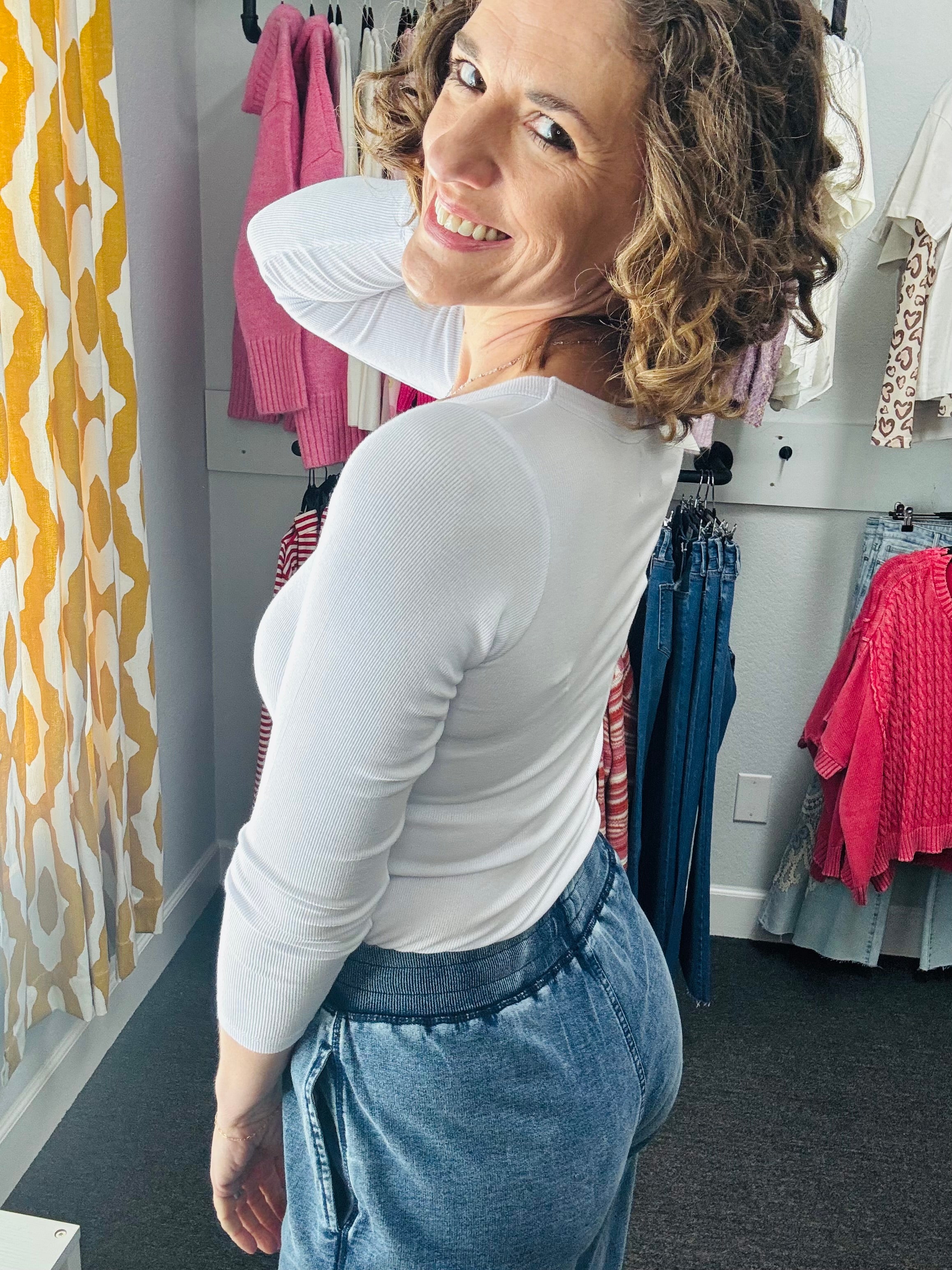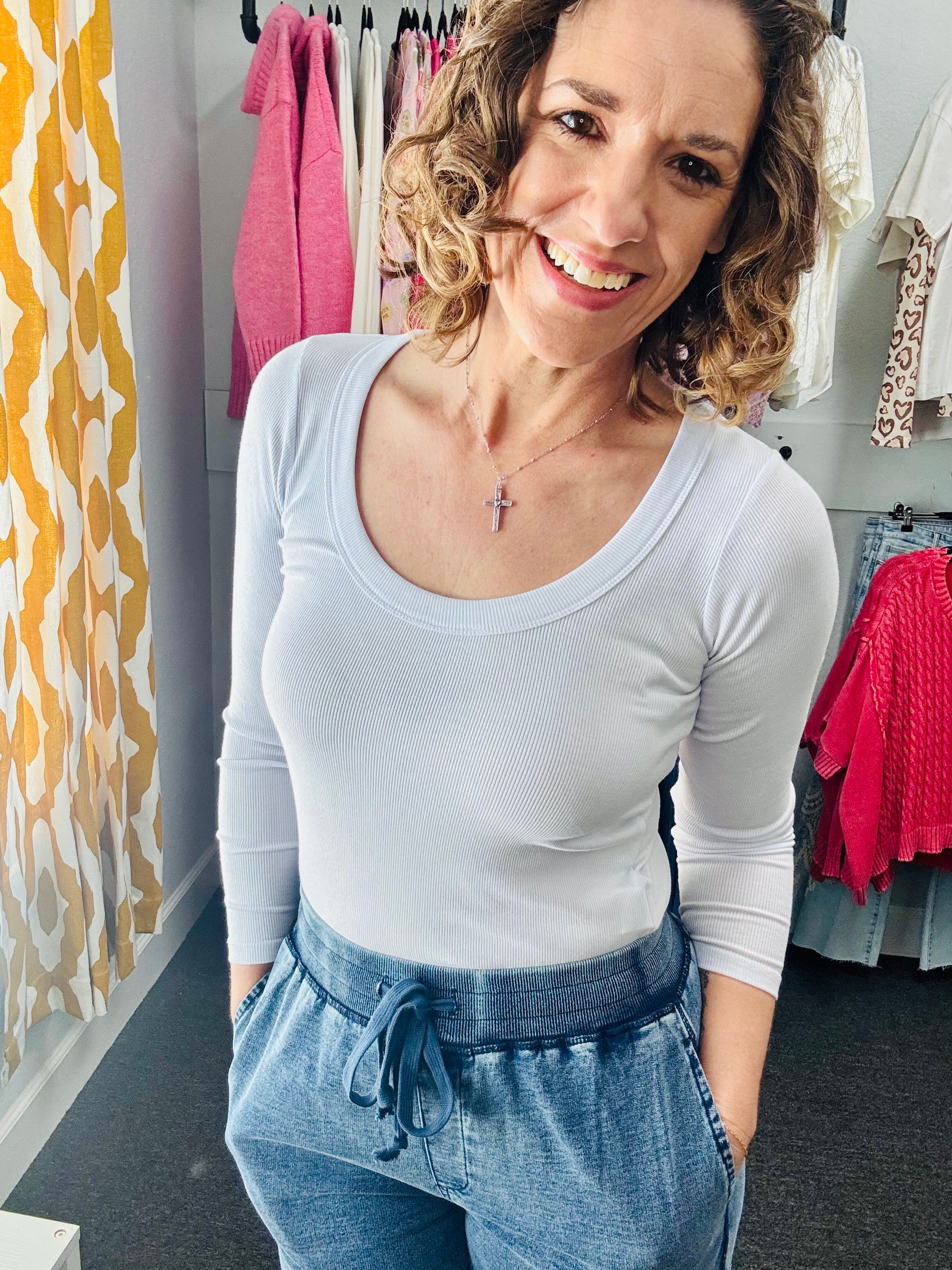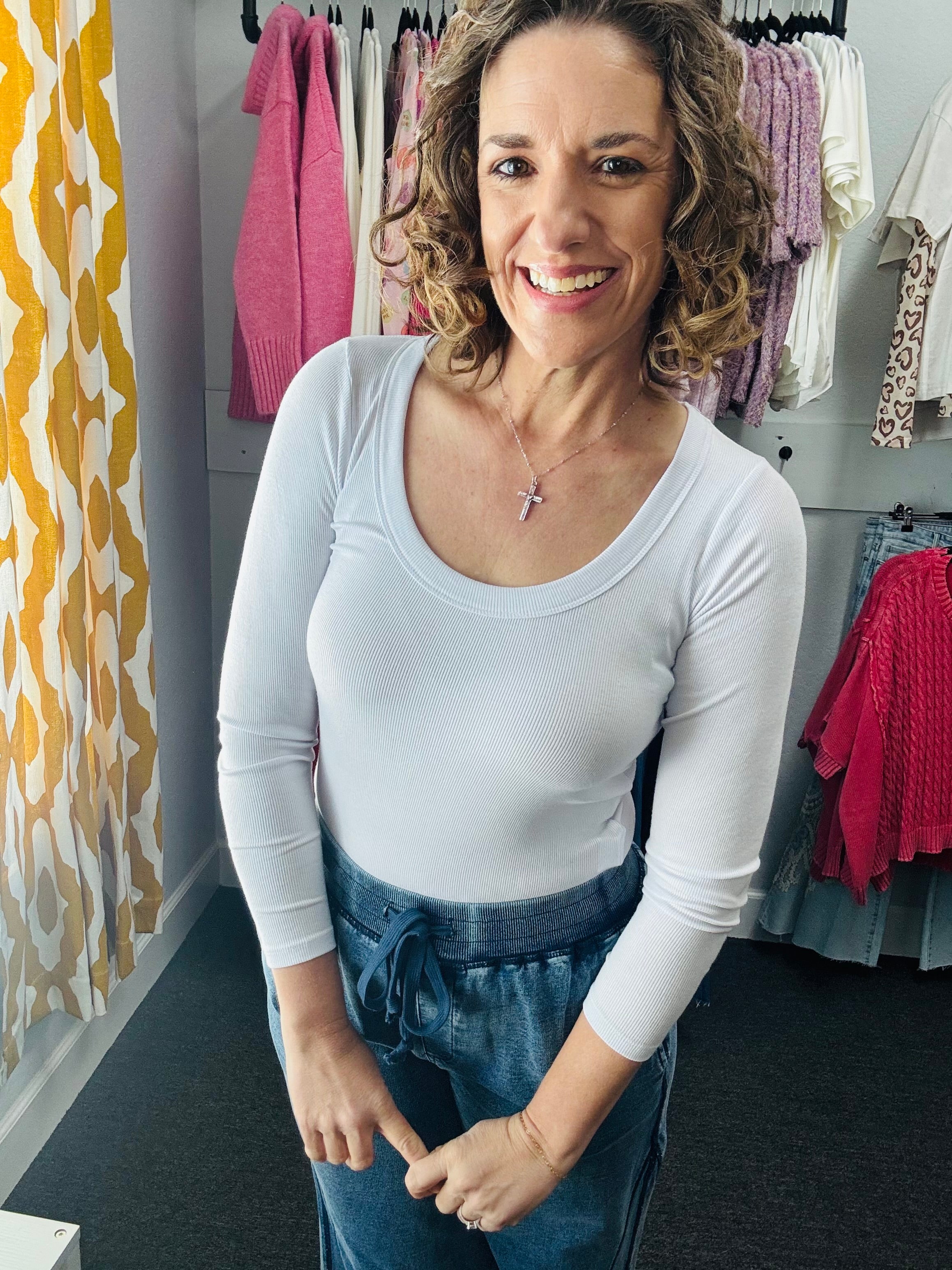 Get ready to scoop up some style with our White Scoop Neck top! Made with rib knit fabric, this top features a flattering scoop neck, a raw edge rounded hem, and long sleeves for a versatile and comfortable look. Perfect for any occasion, dress it up or down for endless outfit possibilities.