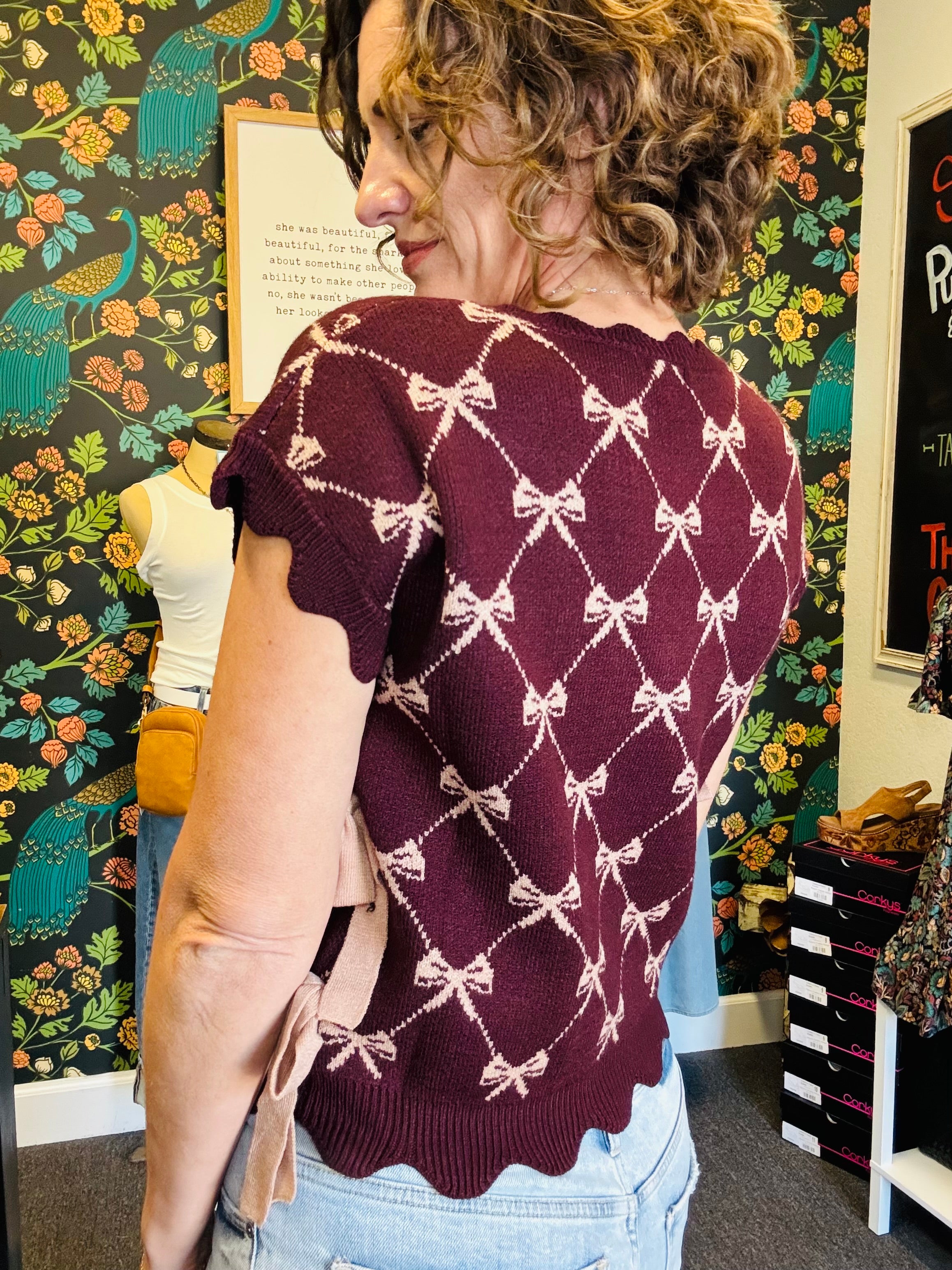 The Burgundy Bow Top is the perfect blend of sweet and sophisticated. This short-sleeve sweater features delicate bow prints and dainty bow accents along the sides for a touch of feminine charm. Designed with a soft, comfy feel and an effortlessly polished look, it’s an easy piece to dress up or down — all at a price you’ll love.